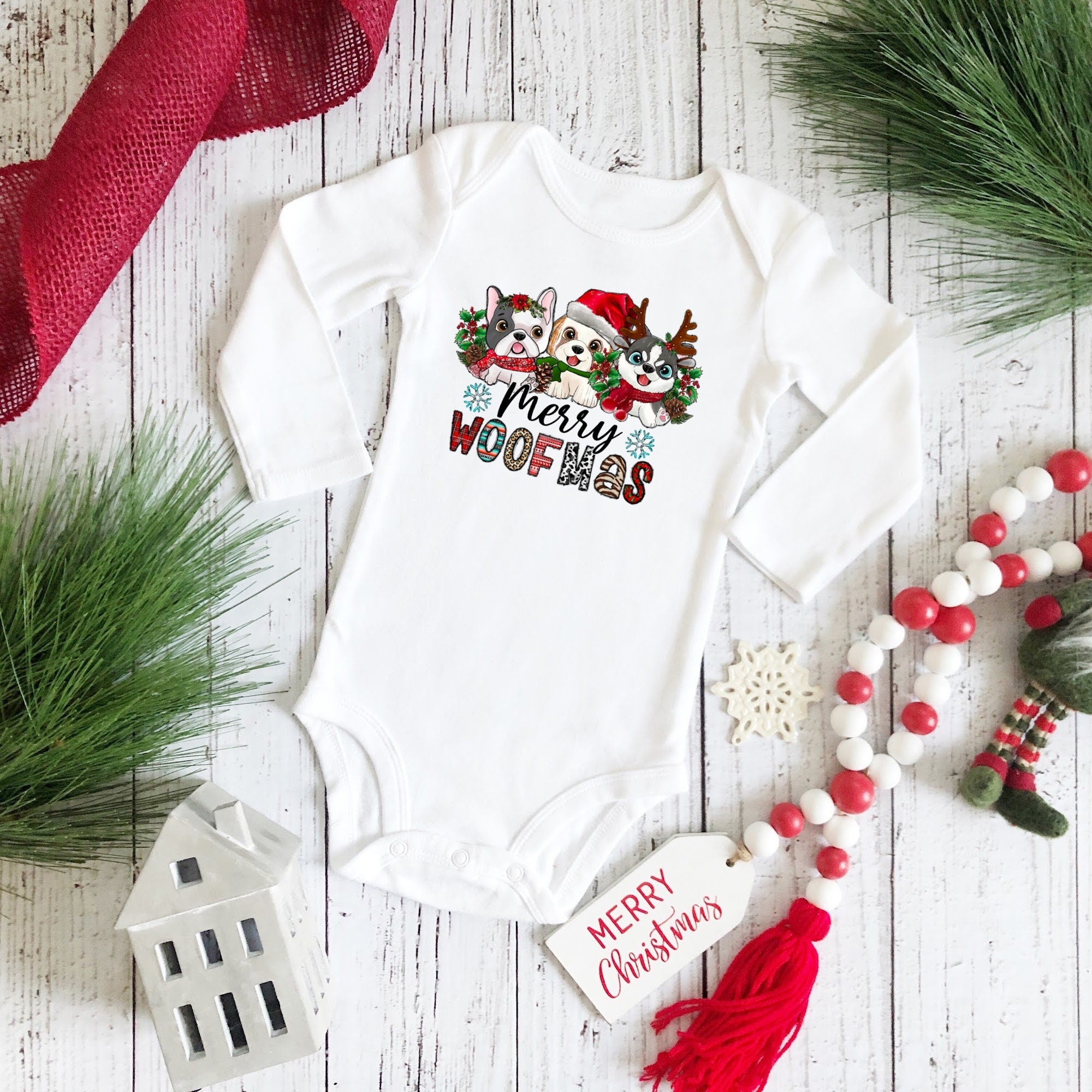 This Baby Onesie featuring Merry Woofmas Dogs printed in vivid Christmas colors is the perfect outfit for baby’s Christmas pics this holiday season.