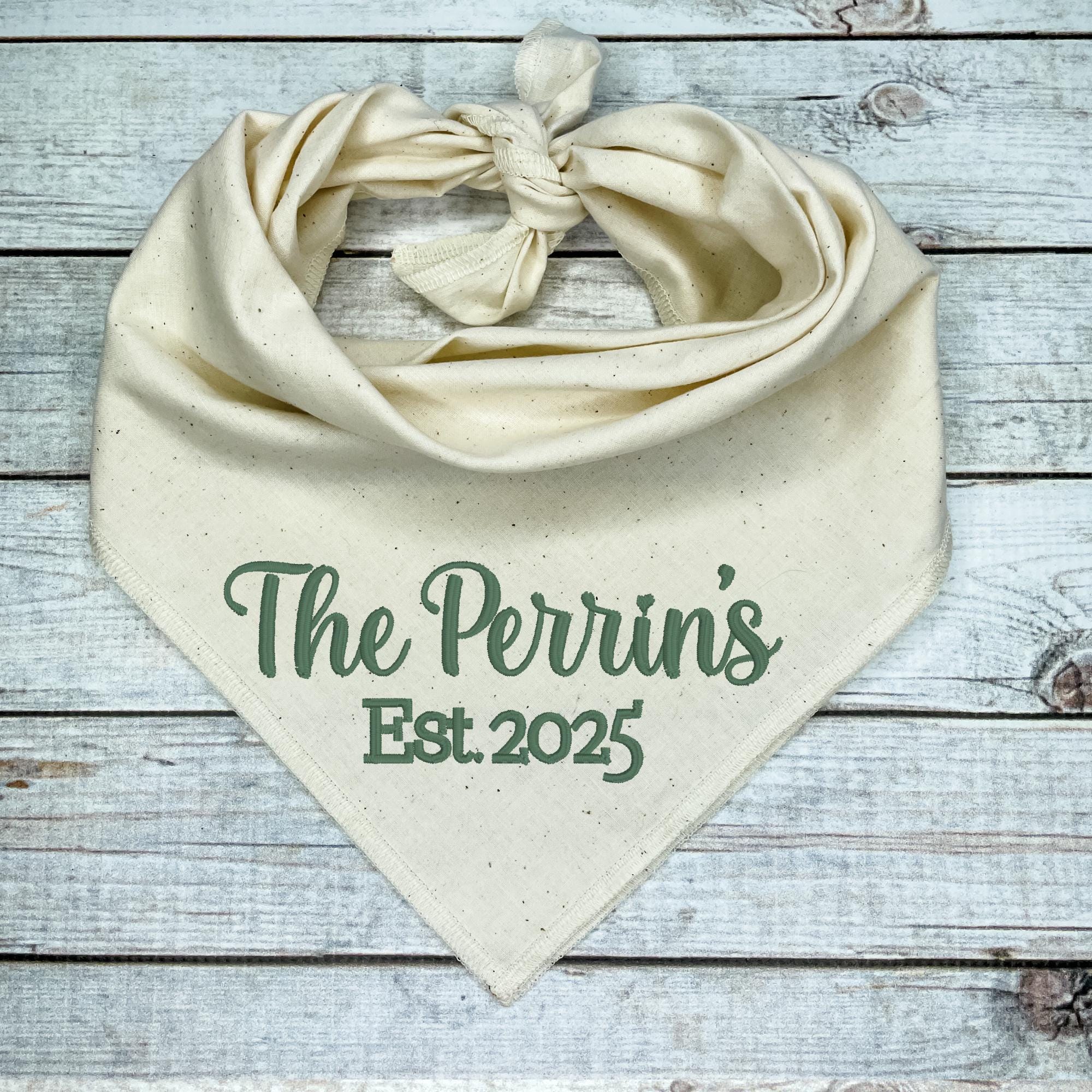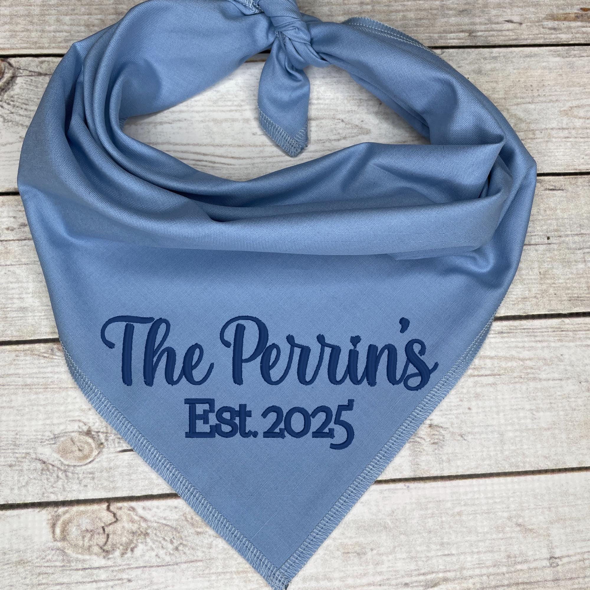Add a personalized touch to your furry friend’s wardrobe with this custom embroidered dog bandana! Crafted with love and attention to detail, this bandana features your couple‘s last name along with the special wedding year, making it the perfect accessory for weddings, anniversaries, or simply celebrating your bond.