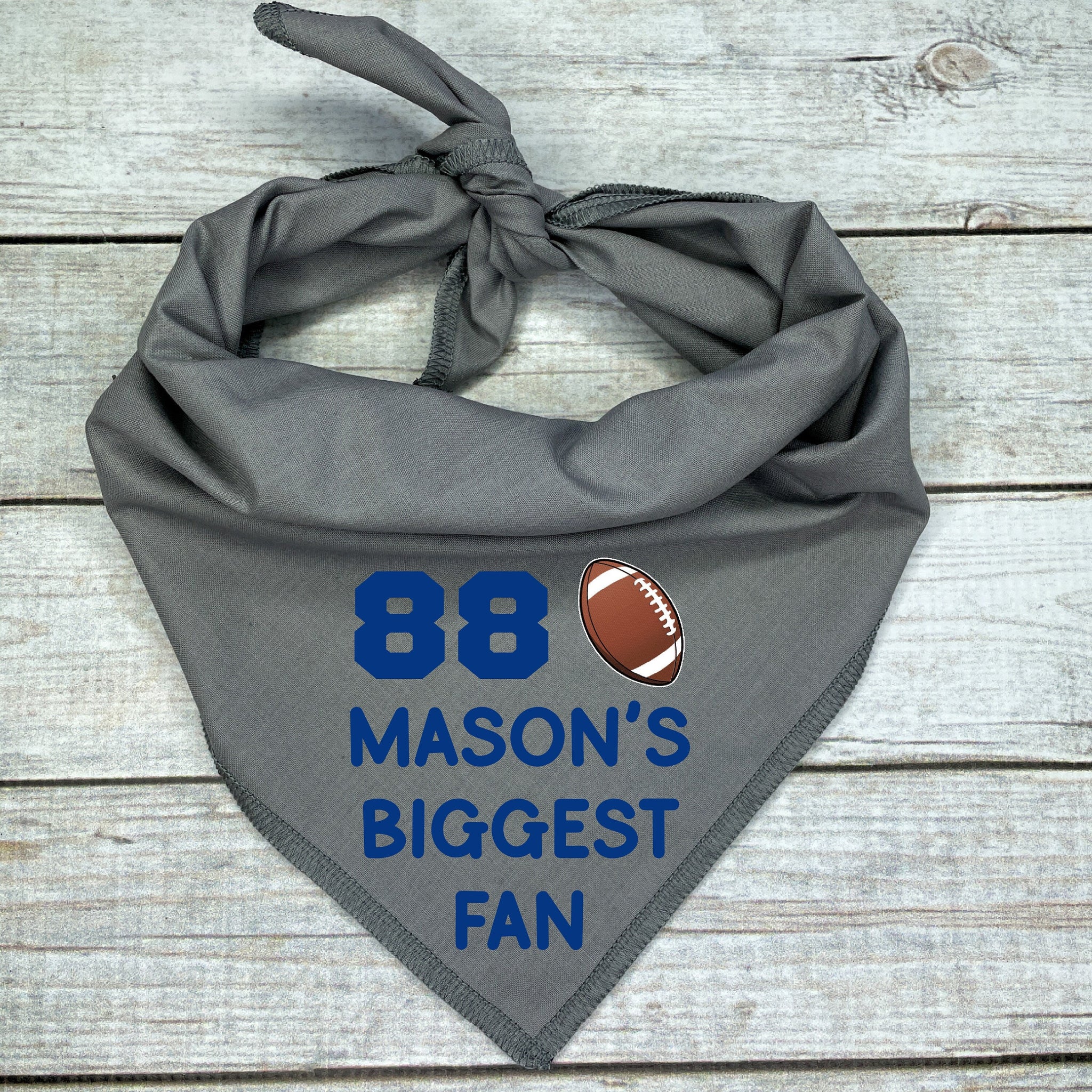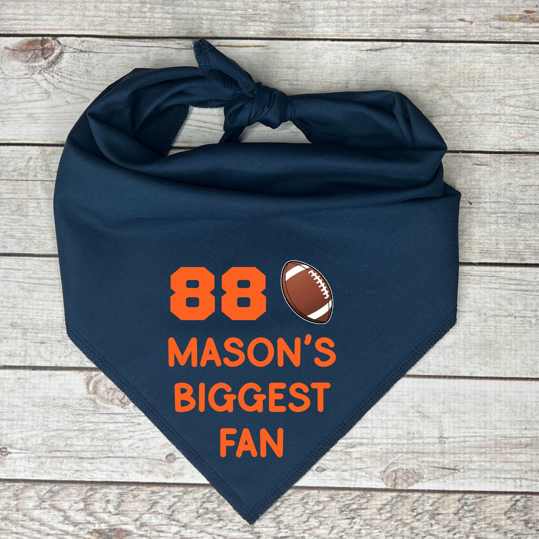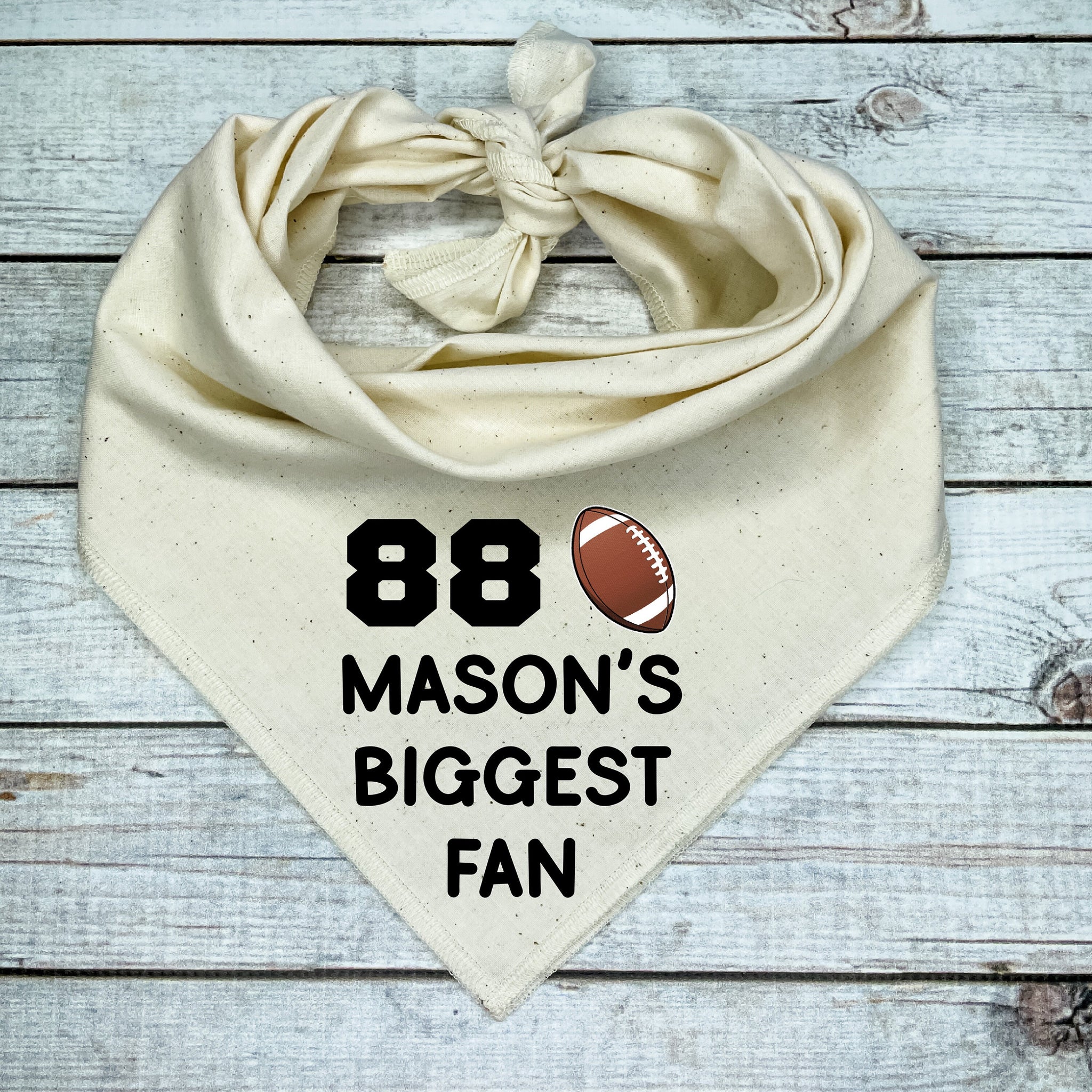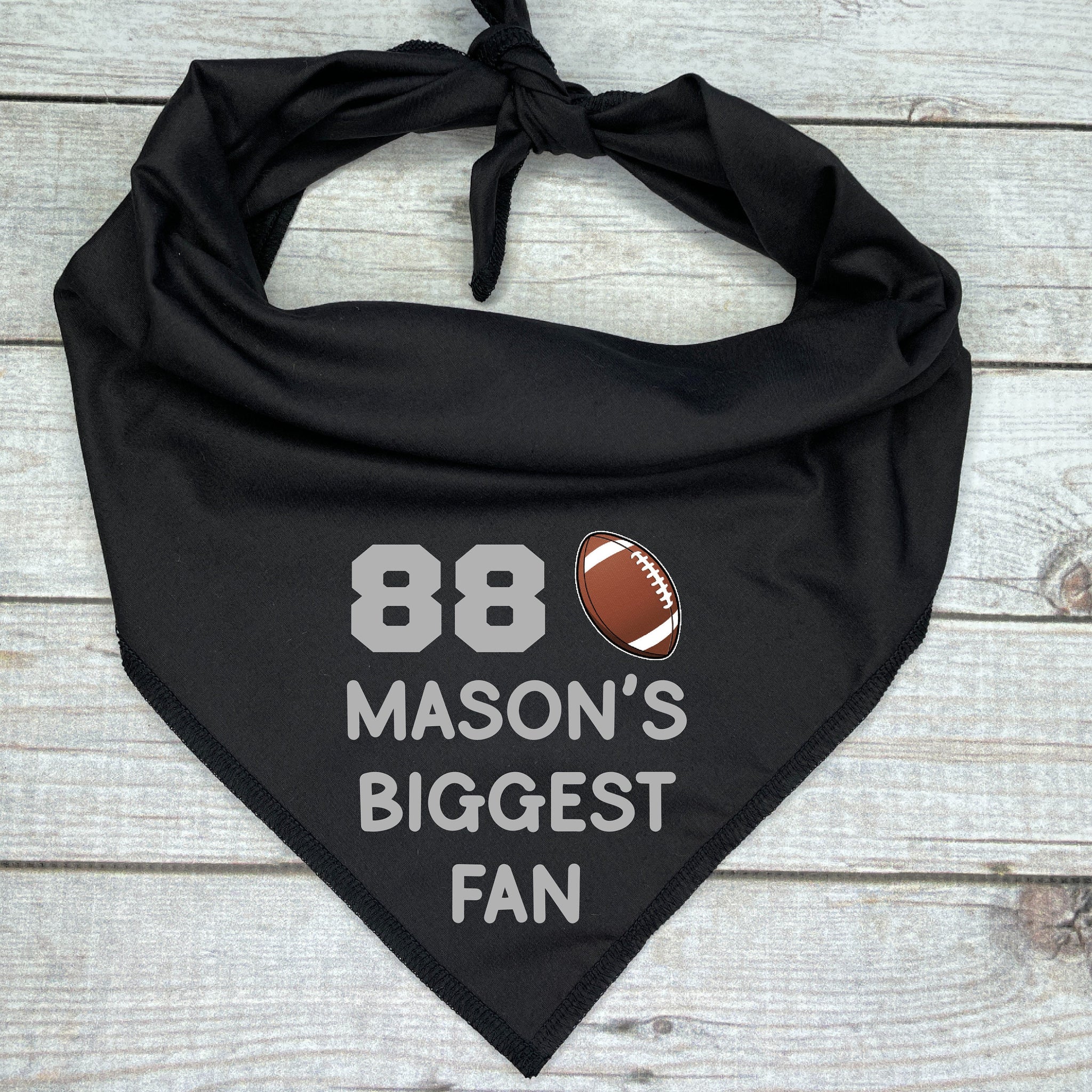 🐾 Your pup is the #1 fan on the field with this Custom Football Dog Bandana – personalized with your child’s jersey number, name, and the phrase “Biggest Fan”! 🏈