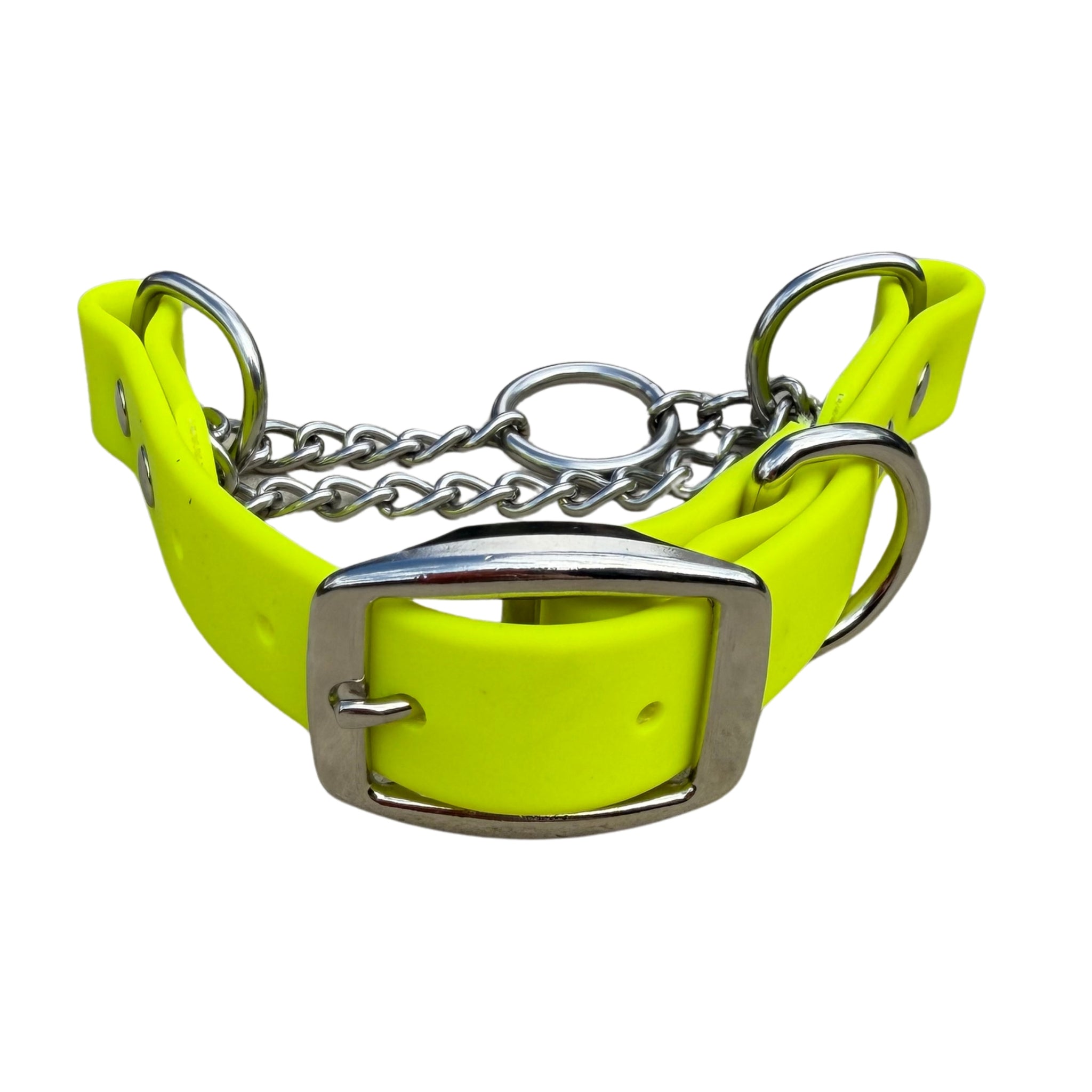 This durable martingale dog collar is made from premium Beta BiothaneĀ® waterproof webbing, designed for strength, comfort, and easy cleaning. The martingale chain provides gentle control for training while the buckle allows quick and convenient on/off.