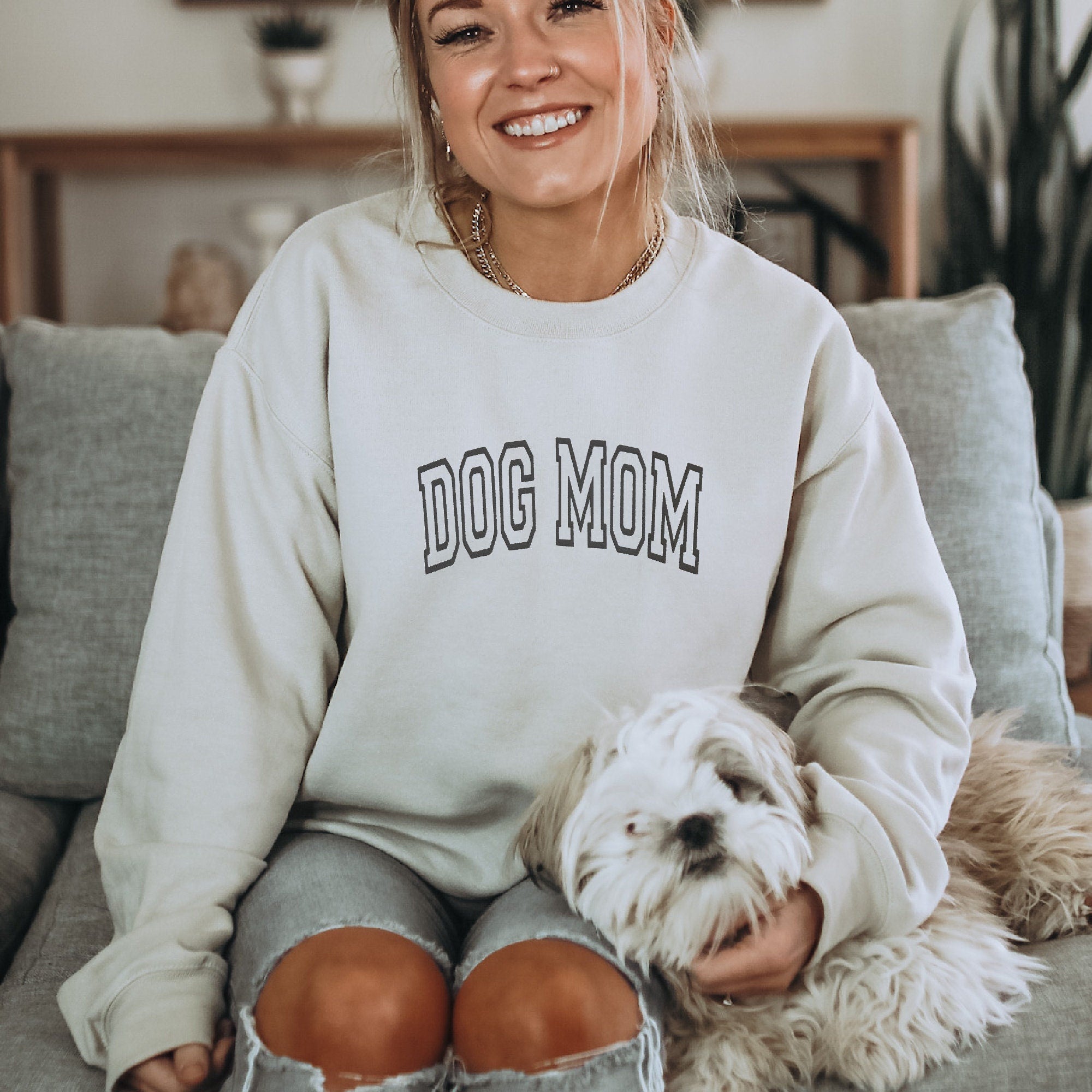 The sweatshirt features the affectionate phrase 'Dog Mom' printed in a tasteful and bold font across the chest, declaring your infinite love and camaraderie with your four-legged companion. The print's superior quality ensures its durability, ensuring the words won't fade even after several washes.