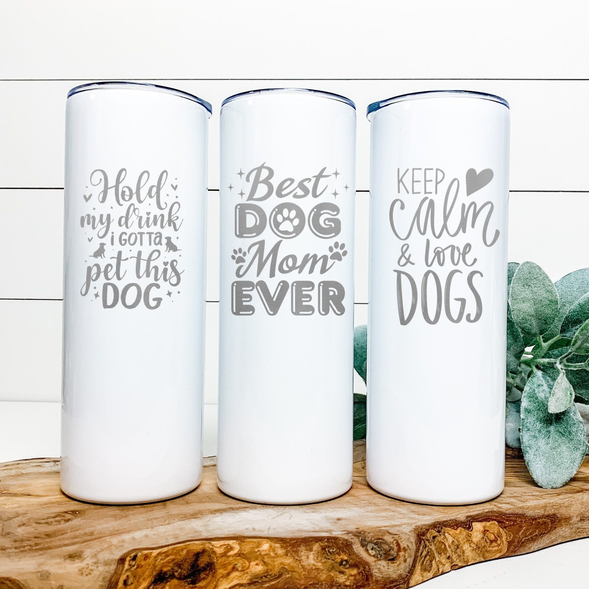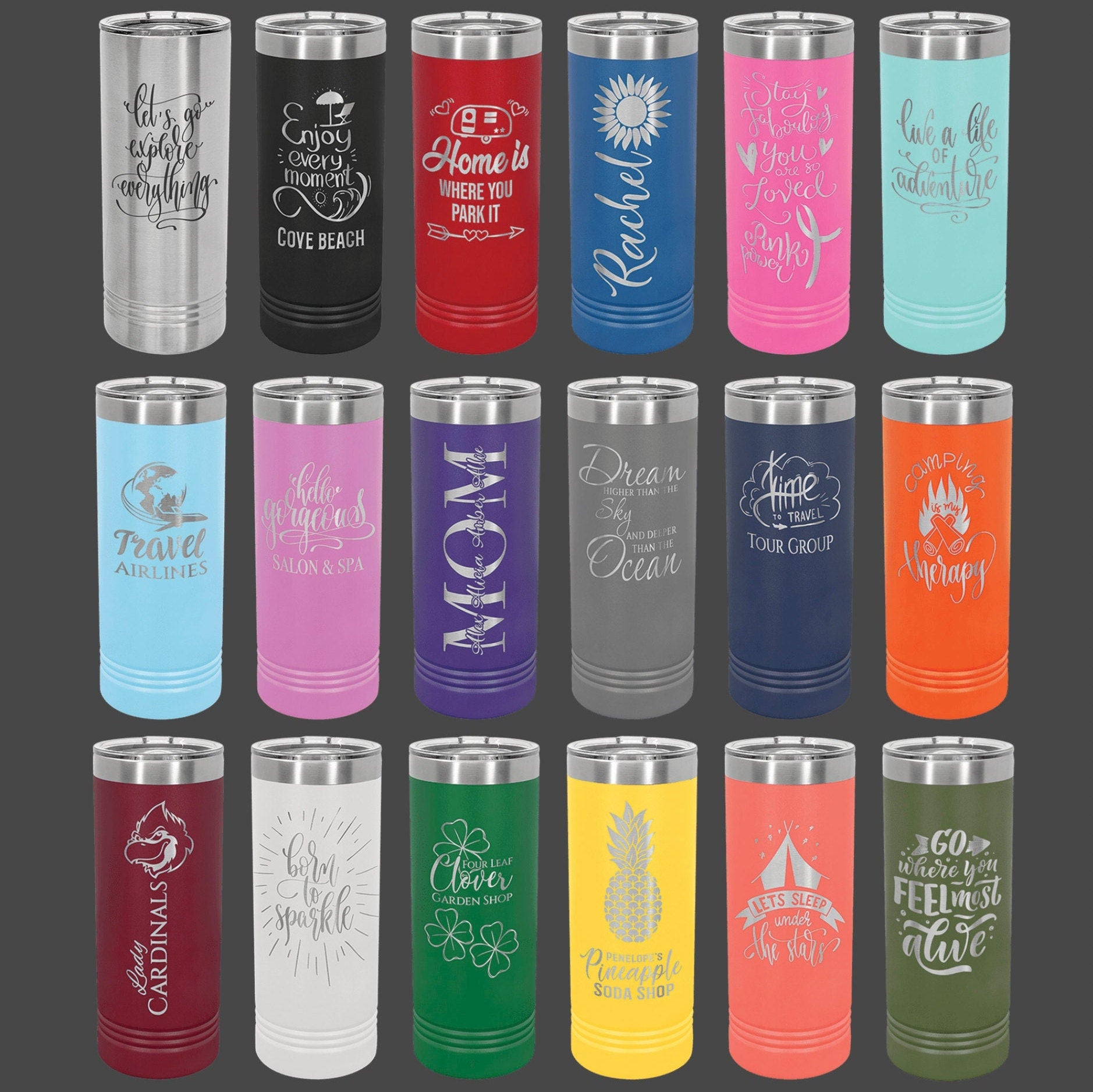 Each tumbler is laser engraved to reveal the stainless steel undercoating.