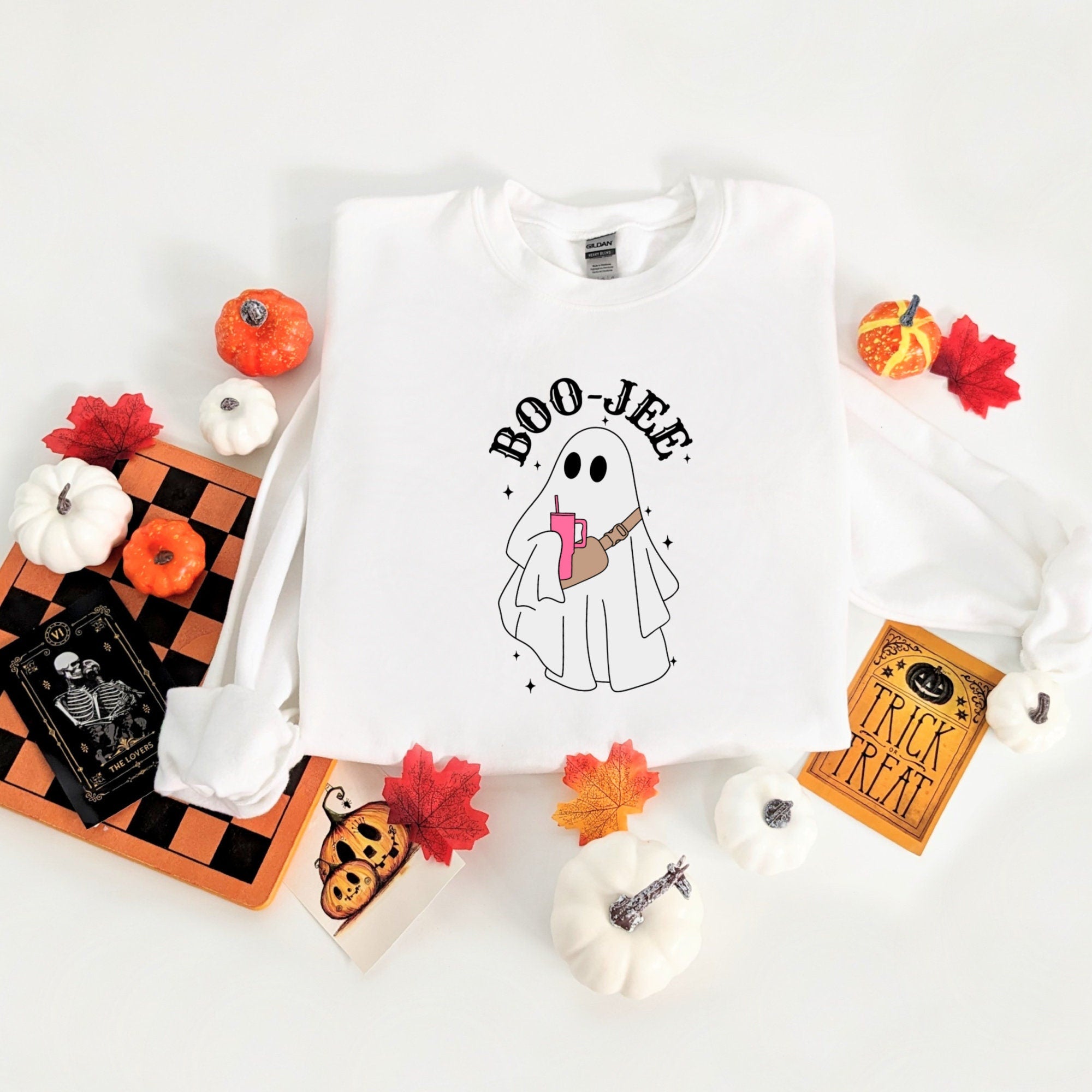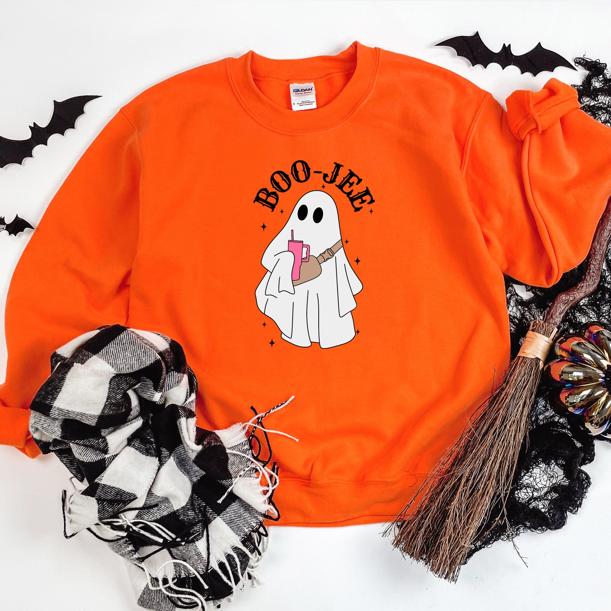 New for Fall 2023 boujee Halloween Sweatshirt. Warm and cozy quality material. Boo-Jee Ghost Graphic can also be printed on a t-shirt.