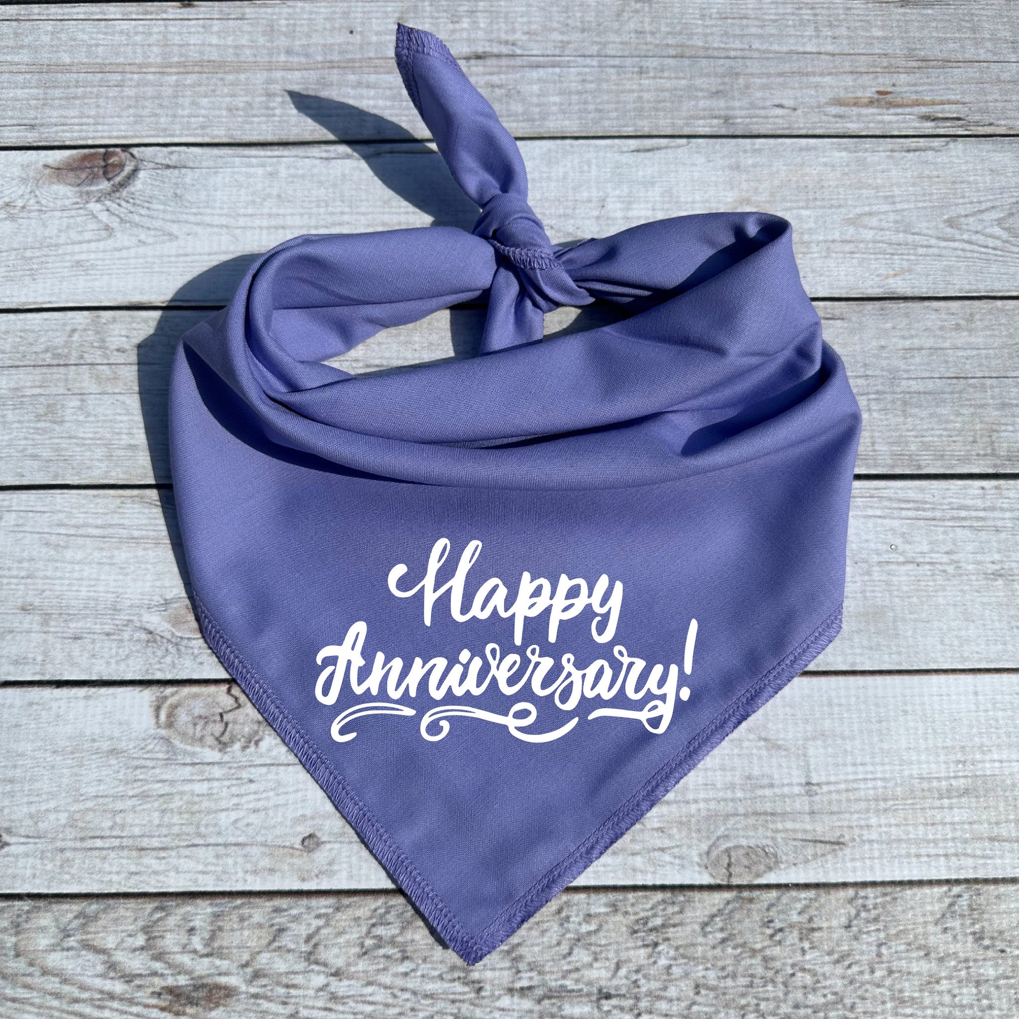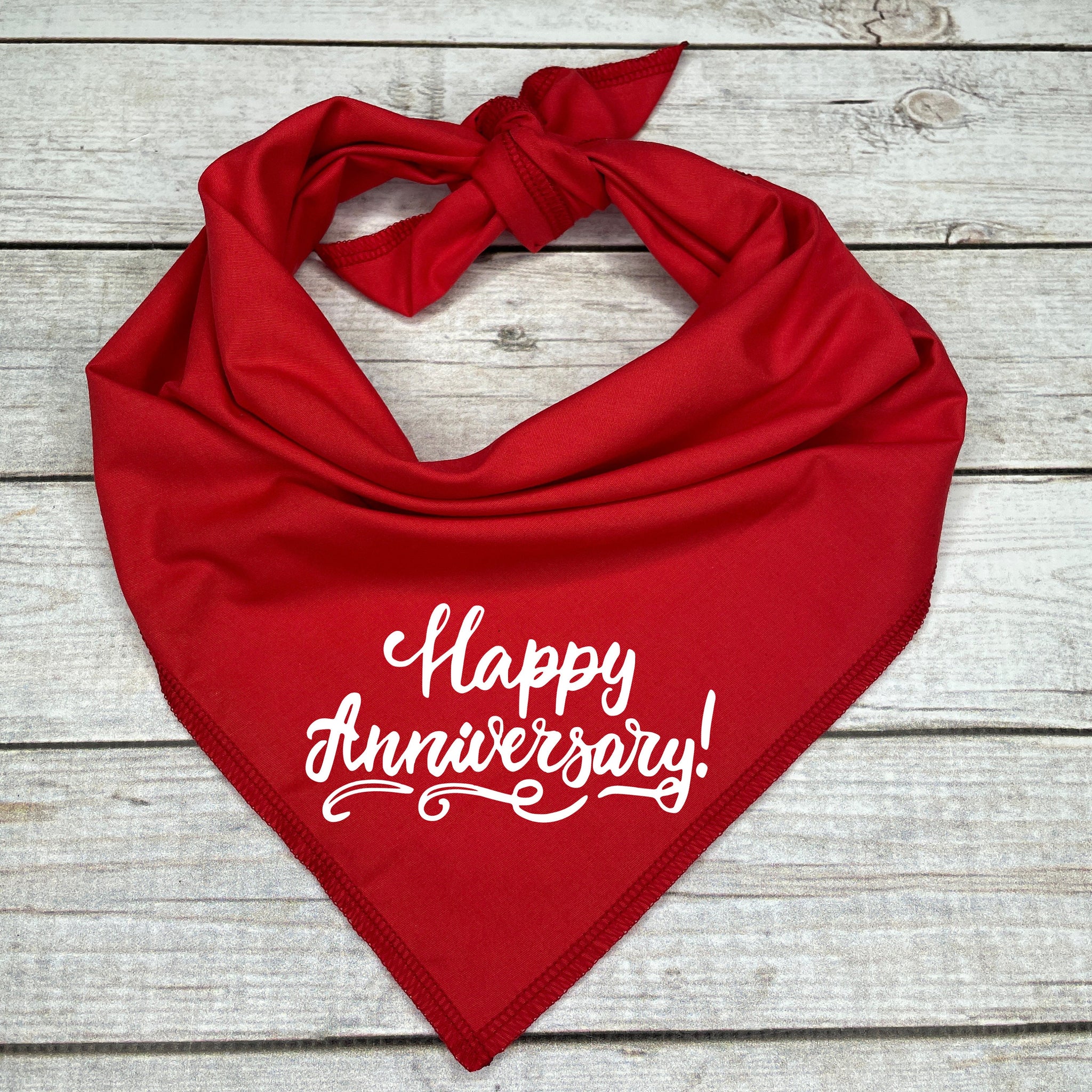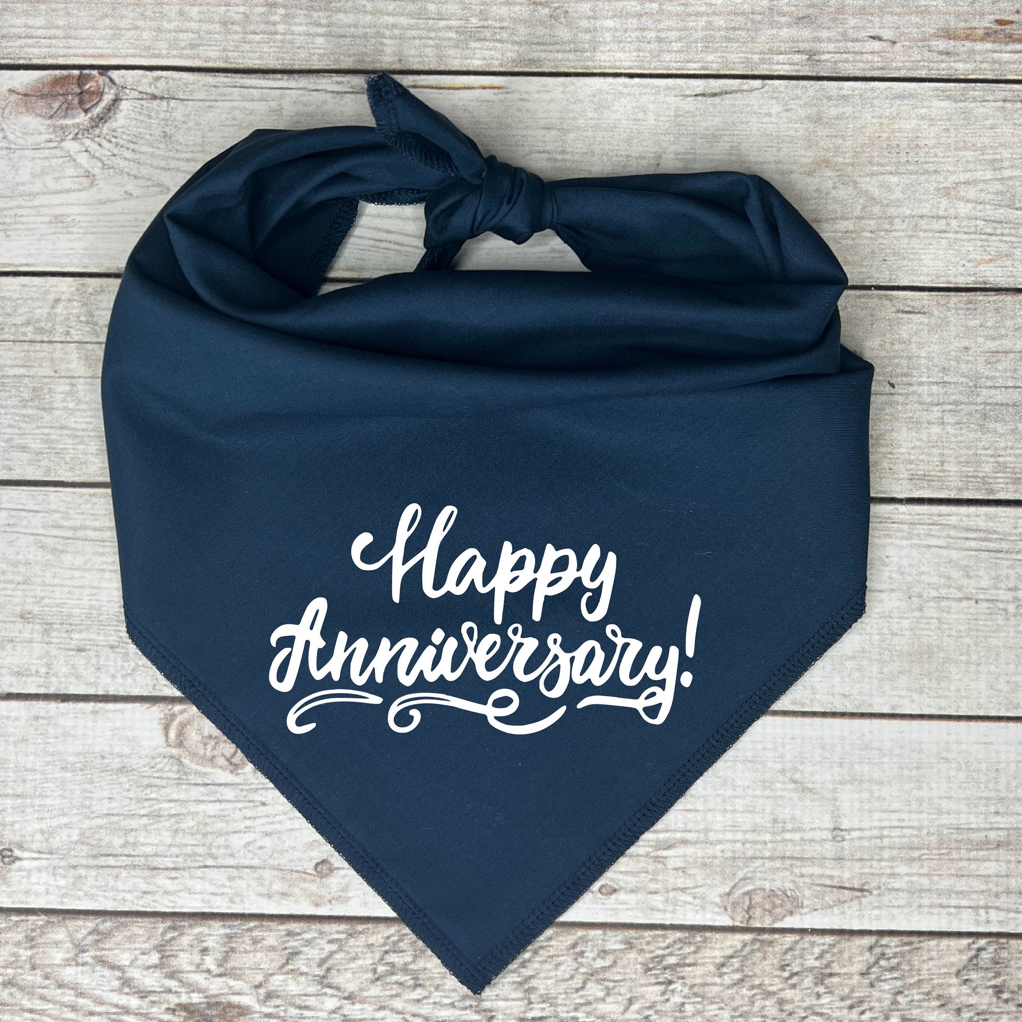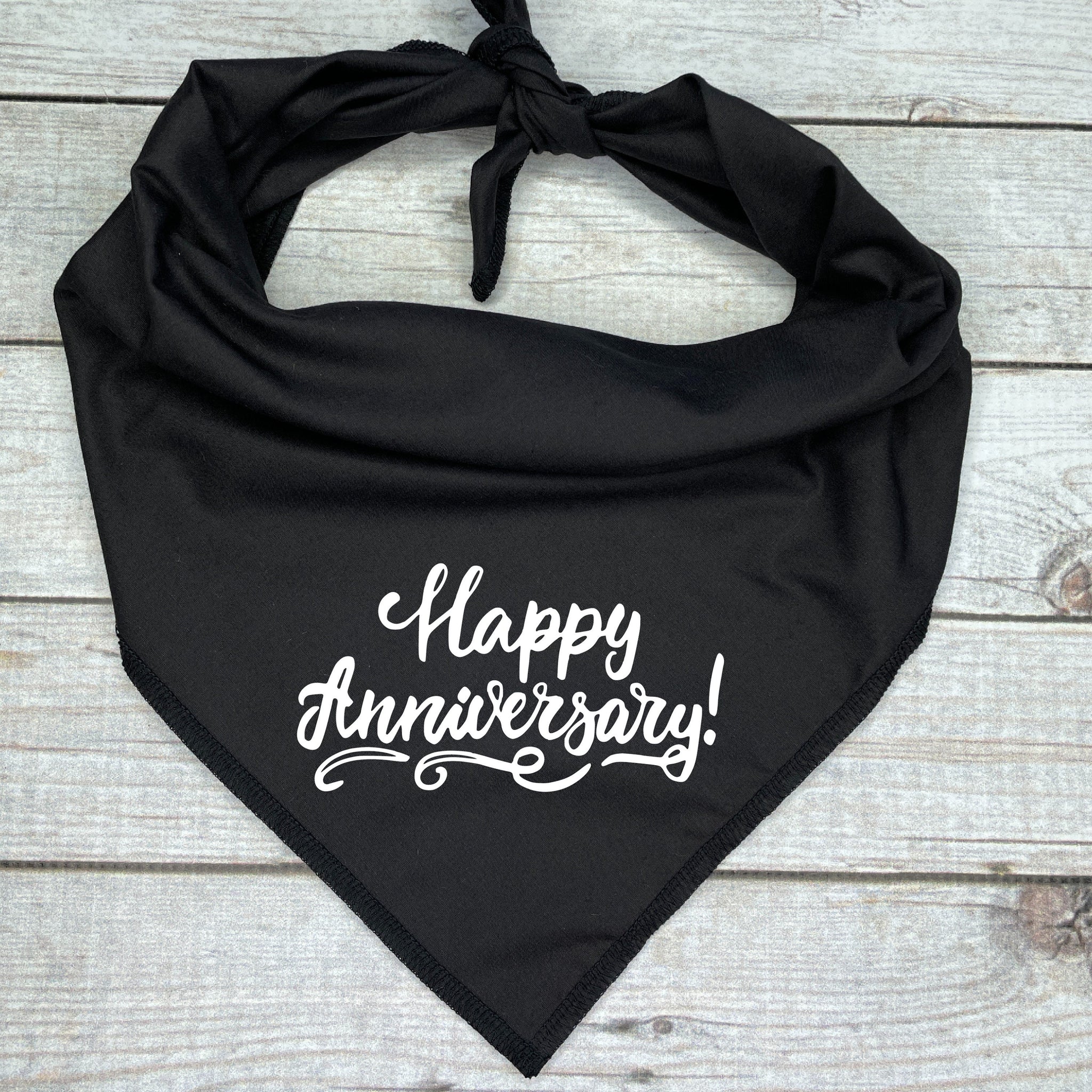 Happy Anniversary dog bandana can be customized whether itโs the 10th, 25th, or 50th wedding anniversary. Perfect gift for Mom and Dad, Grandparents, or any dog lover couple to celebrate the special occasion! We also print anniversary shirts, and hats, and more.