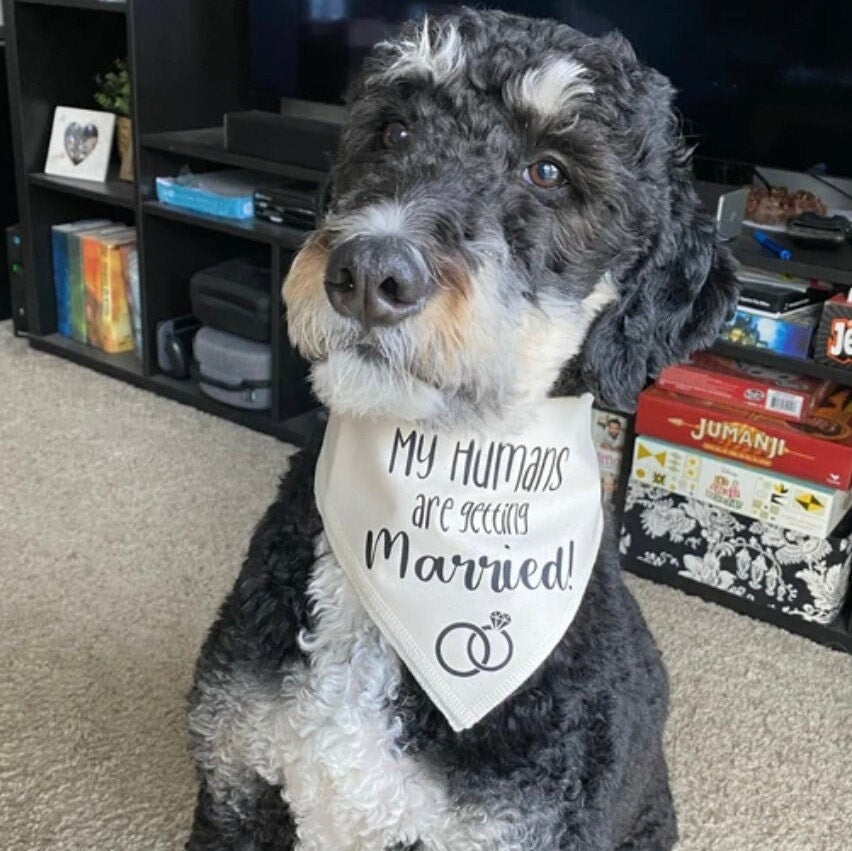 Order your "My Humans are Getting Married" dog bandana today, and treat your furry friend to an experience they will cherish alongside you and your loved ones on your wedding day.