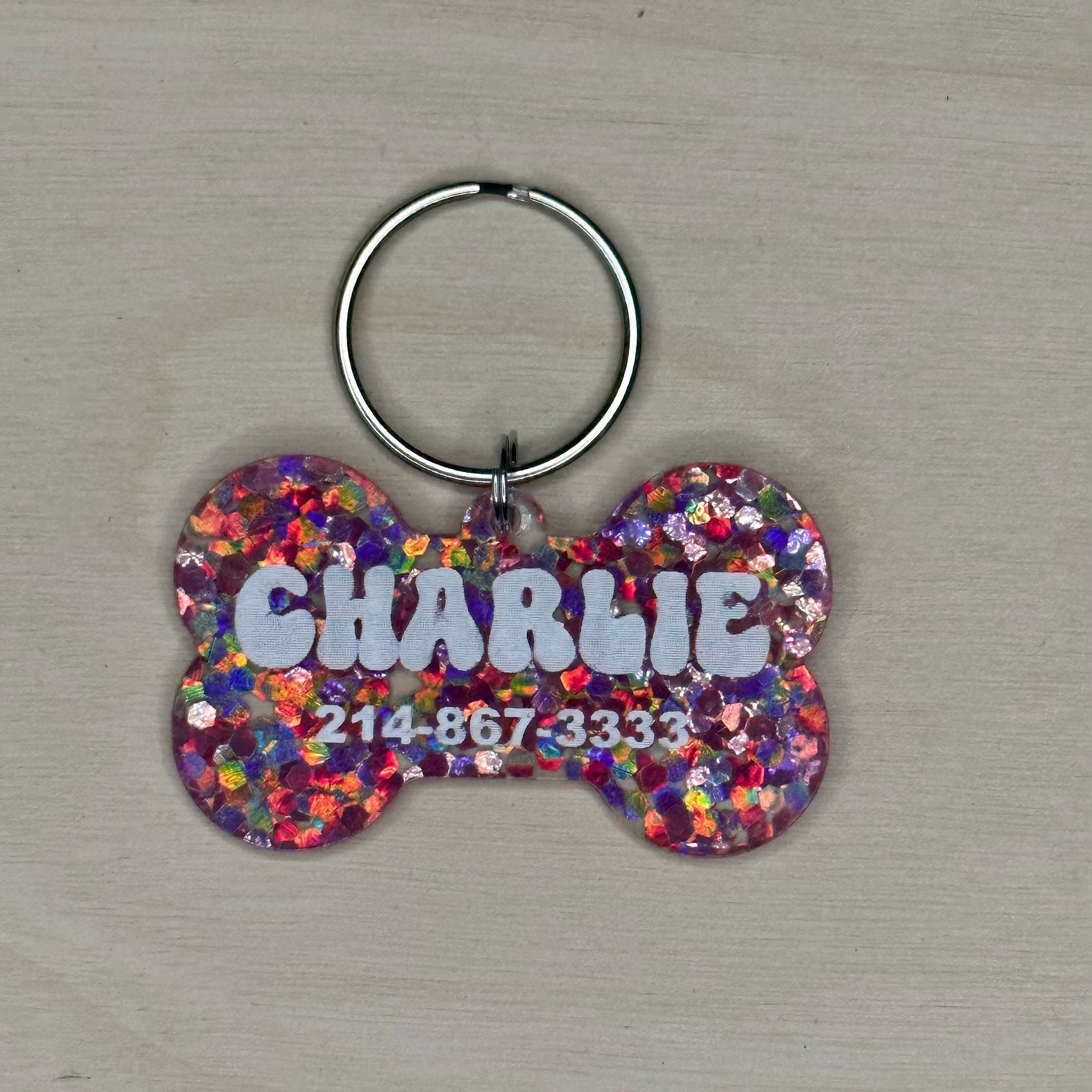Delight in the unique charm of our Personalized Bone-Shaped Acrylic Dog Tag. Designed thoughtfully with your canine friend in mind, this sparkly tag adds both style and function to your dog's collar.