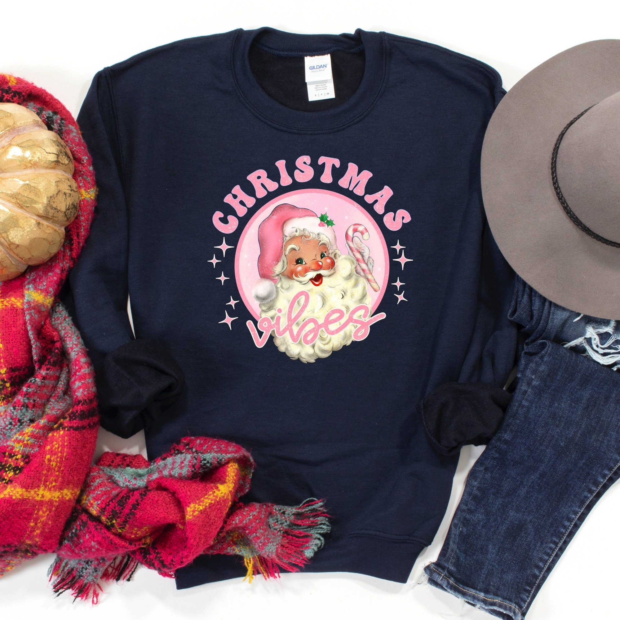 Christmas sweatshirt for her featuring a pink Santa Clause Christmas Vibes print. Multiple colors and sizes available. Makes a great Christmas present for Mom, sister, best friend, wife, daughter, or niece.