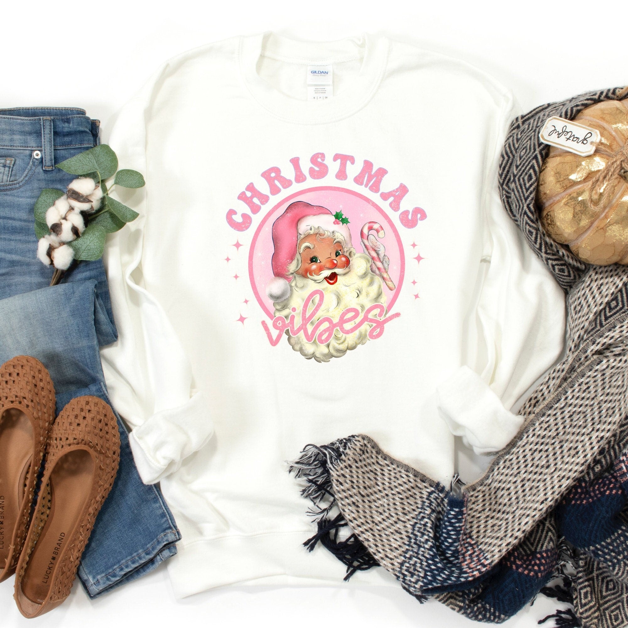 Womens Christmas Sweatshirt, Pink Christmas Vibes Print featuring Santa Clause, Christmas Gift for Her
